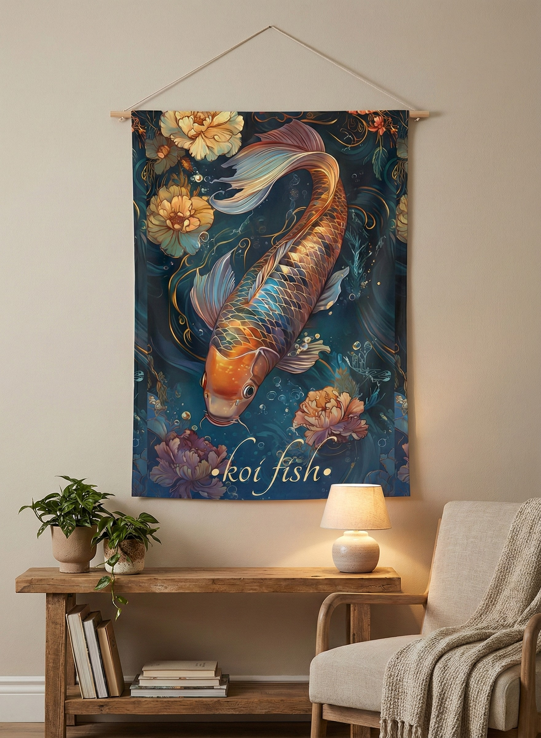 Framed photograph of camels in a desert scene on a wall above a wooden console table.